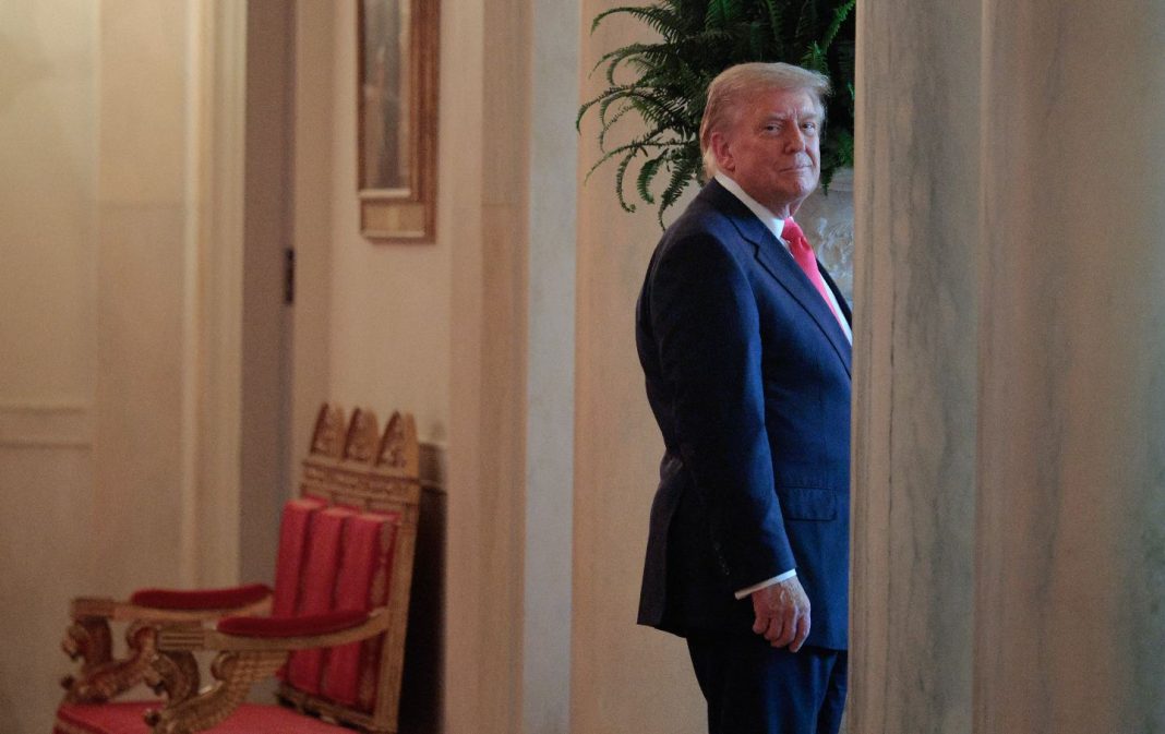 Donald Trump stops in the White House Cross Hall to listen to the band at the conclusion of a “One, Big, Beautiful” event.