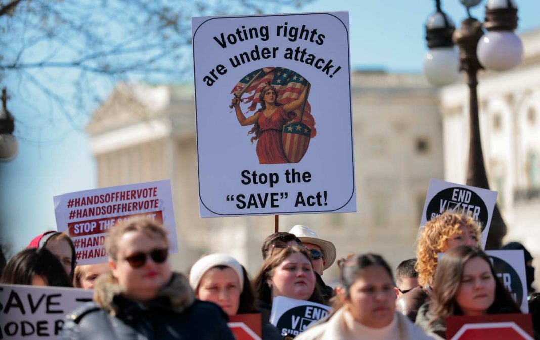 Demonstrators at a rally against the SAVE America Act outside the US Capitol.
