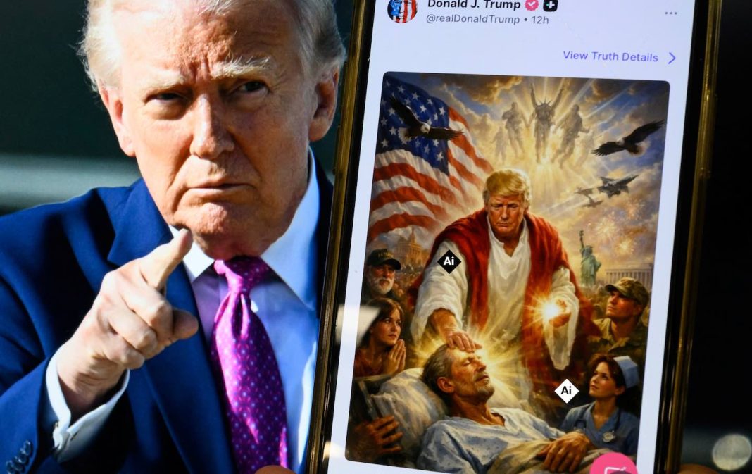 President Donald Trump with an AI-generated picture he posted on his Truth Social platform, depicting himself as Jesus Christ, after criticizing Pope Leo XIV.