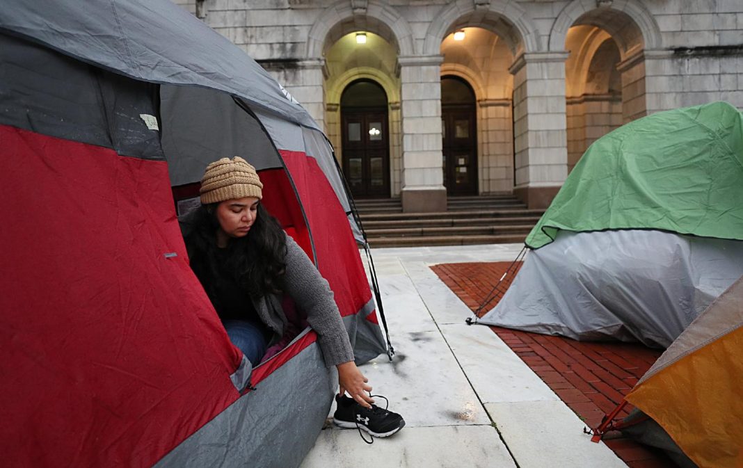 Rhode Island State Senator Cynthia Mendes woke up from her sixth straight night of sleeping in a tent at the Rhode Island Statehouse in Providence, Rhode Island, on December 6, 2021.