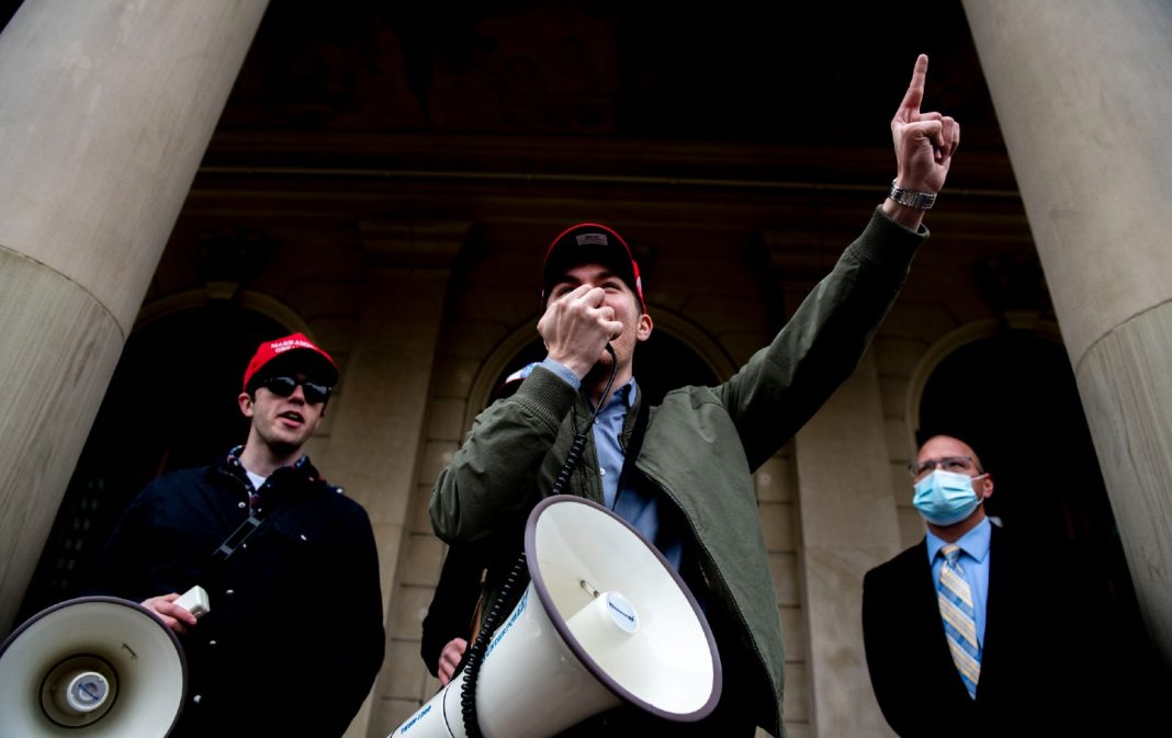 White nationalist Nick Fuentes speaks during a rally at the Capitol in Lansing, Michigan, November 2020.