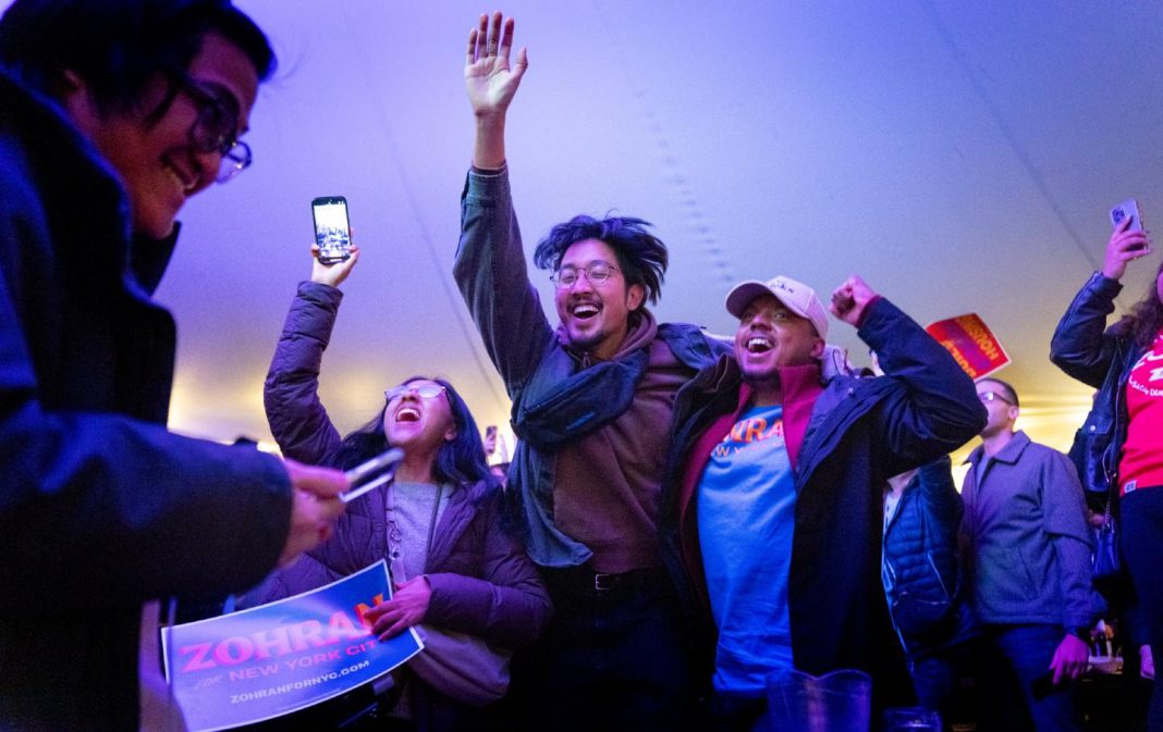 New Yorkers celebrate as NY1 projects Zohran Mamdani winner in the mayoral election, at the Bohemian Hall & Beer Garden on November 4, 2025 in the Astoria neighborhood of New York City. The watch party was one of many hosted by the Democratic Socialists of America in support of Mamdani.