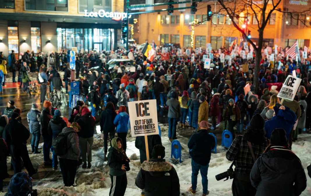 Demonstrators during a protest in Minneapolis on January 8, 2026. An ICE officer fatally shot a woman during a confrontation in Minneapolis, sparking an uproar over the presence of ICE agents in the city