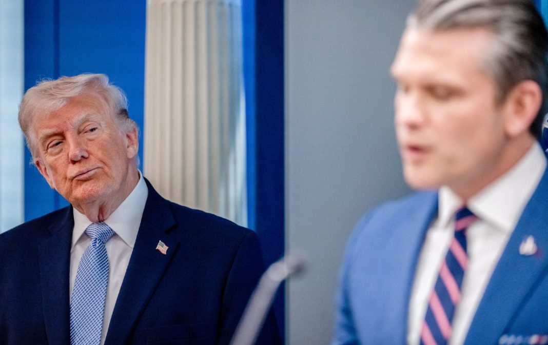 President Donald Trump, and Pete Hegseth, US secretary of defense, during a news conference in the White House on April 6, 2026.